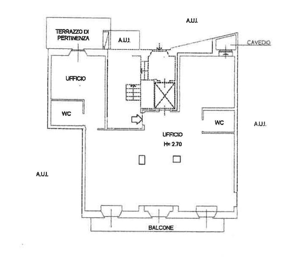 Posto al piano primo servito da ascensore, si compone di ingresso, ampio locale open space, tre locali ad uso ufficio, due bagni, terrazzo retrostante e balcone affacciato sulla centralissima via Roma.