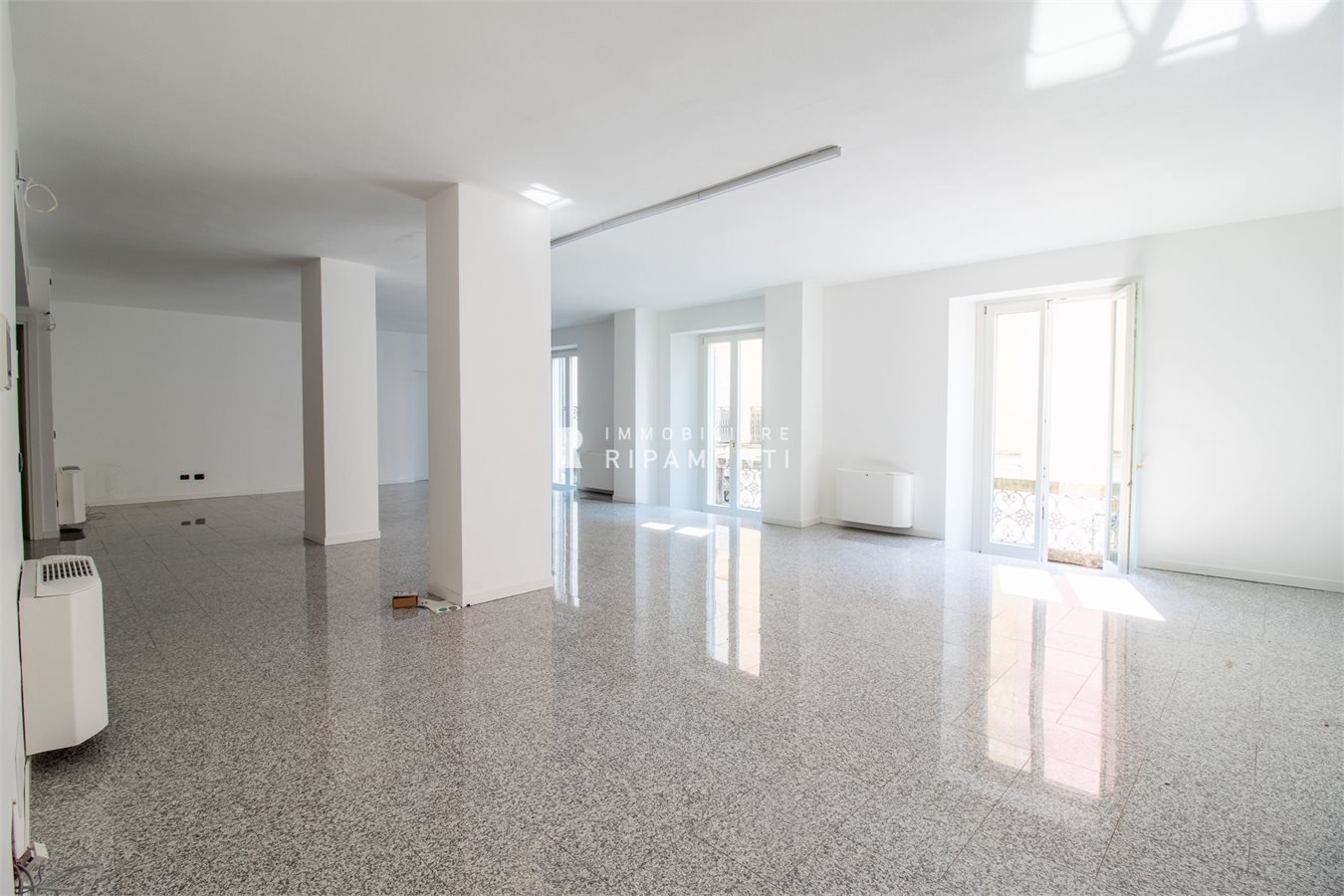 Posto al piano primo servito da ascensore, si compone di ingresso, ampio locale open space, tre locali ad uso ufficio, due bagni, terrazzo retrostante e balcone affacciato sulla centralissima via Roma.